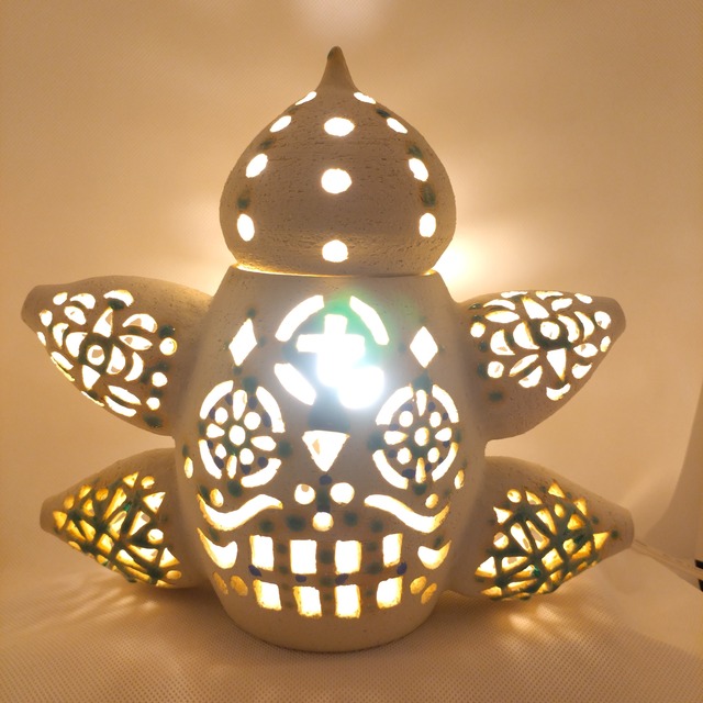 ◆本体直径約22cm×高さ約24cm ◆蓋にややガタつき有り(ご了承の上よろしくお願いいたします)使用には問題ありません。 ◆白素地系 ◯素材:陶 「今宵、生贄の花の名の許に」照明作品 好きだった音楽に感銘を受け、その詩からインスパイアされた題名です。 髑髏には花を手向け、あちらの世界でも華やかに。 またメキシコの死者の祭りも大好きでそこからもイメージを受けました。 表も裏も、横もしっかりと切り込みを入れて かなりきれいに光が散乱します。 お部屋で使って頂けるとても美しく発光いたします。 一点物です。 ☆蓋の部分にガタつきが有ります。こちらを込みでの価格となっております。 使用には問題ありませんので安心してご使用下さい。 *なるべく実物の色味に近づけて撮影していますが、天候やお使いのモニターによって若干の違いが見られる場合がございます。ご了承ください。 *表面にヒビやピンスポットのようなものが見受けられる場合がございますが、これは成型時の乾燥や土の特性によるもので、ご使用上問題はございません。デザインの一部としてお楽しみください。 【ご使用上の注意】 ・使い方 LED電球でない場合、上部が熱くなる場合があります。 蓋部分が熱を帯びている時には触らないようにお気をつけ下さい。 LED電球を推奨いたします。 【お手入れ方法】 ・時々筆などでホコリを払ったり、気になる時には 掃除機の吸い口を作品に直接当てずに作品より1cm位離した状態で軽く吸引してみて下さい。 ※水洗いなど電源に水分をかけるなどの行為はおやめ下さい。 汚れなどがあった場合は乾いた布等で拭く程度にお願いいたします。 ・・・・・・・・・・・・・・・・・・・・ ゆうぱっくでお届けします。ご希望の到着日時等ございましたら備考欄にご記入ください。
