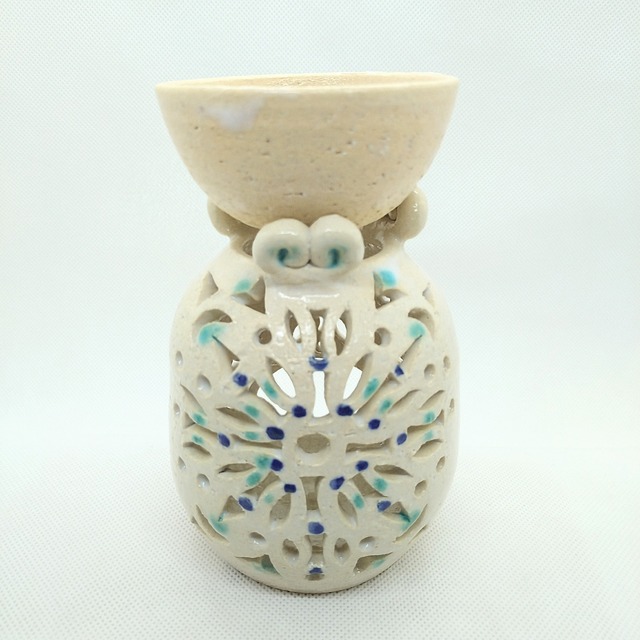 ◆本体直径約9cm×高さ約11,5cm ◆蓋直径約8cm×高さ約4cm ◆蓋含め高さ約14cm ◆白系 ◯素材:陶 『アロマポット 白』は、 アート的なデザインと機能性を兼ね備えた逸品です。 たくさんの切り込みから生まれる美しい影が、 お部屋を幻想的に彩り、リラックスしたひとときを演出します。香炉としても活用でき、香りを楽しむことができるのも魅力のひとつです。 お部屋のアクセントとして、また特別な日の演出にもぴったりです。同じデザインのものは二つとない一品を、ぜひお楽しみください。 ・小さなカップ型キャンドル使用可能 ・観賞用としてLEDキャンドルの使用可能(上部より出し入れ可) *なるべく実物の色味に近づけて撮影していますが、天候やお使いのモニターによって若干の違いが見られる場合がございます。ご了承ください。 *表面にヒビやピンスポットのようなものが見受けられる場合がございますが、これは成型時の乾燥や土の特性によるもので、ご使用上問題はございません。デザインの一部としてお楽しみください。 【ご使用上の注意】 ・使い方 炎を使用する場合は、周囲に注意して燃えやすいものが無いように安全にお使いください。 ※直火キャンドルを使う場合は上部がかなり熱くなります。使用時は絶対に上部を触らないで下さい。 蓋を外す時は絶対に脇を持つか、冷却してからお願いいたします。 ☆ご使用後は必ず冷却し、適切にお手入れを行ってください。 【お手入れ方法】 ・柔らかいスポンジと中性洗剤でやさしく手洗いしてください。水分を含んだまましまうとカビや臭いの原因になりますので、必ずよく乾燥させてから収納してください。 ※食器洗浄機・オーブンは使用しないでください。 ・・・・・・・・・・・・・・・・・・・・ ゆうぱっくでお届けします。ご希望の到着日時等ございましたら備考欄にご記入ください。