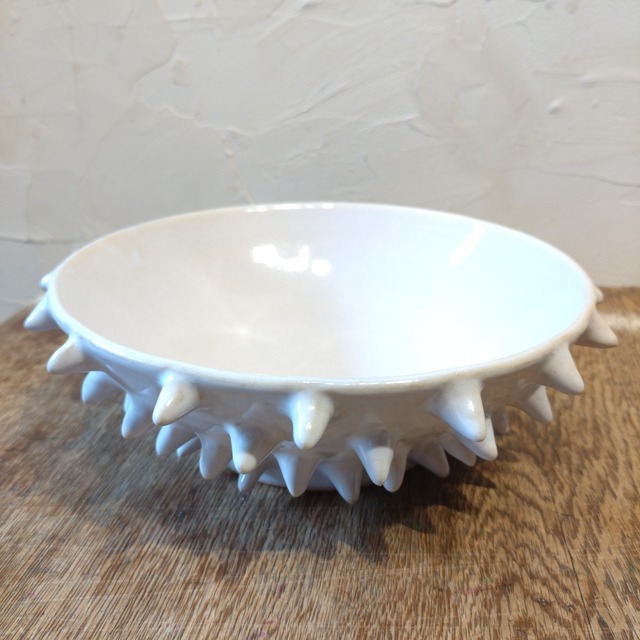 ◆サイズ:Ф/直径約19cm×高さ約7cm ◆うつわ色:白系 「トツトツの山びこ」 白い山の彼方の山びこが響く。 生き物のように、惑星のように、ツブツブとした鎧を纏う。 そこにある存在感。 鮮やかな白が、不思議な形があなたの食卓を楽しく彩ります。 同じものは一つもないアートな一品を あなたの元へ。 *出来るだけ実物の色味に近づけて撮影していますが、天候・お使いのモニターによって若干の違いが見られる場合がございます、ご了承下さい。 *表面にヒビやピンスポットのようなものが見受けられる場合がございますが、成型時の乾燥や土の特性(石はぜなど)、表面の釉薬によるものでご使用上問題ございません、デザインの一部としてお楽しみください。また釉薬の掛かり方によっては濃い部分と薄い部分がございます。こちらも使用には全く問題ありません。陶器の風景としてご理解頂けますようお願いいたします。 【ご使用上の注意】 ・使い始め はじめて使う前には目止めをすることをおすすめします。素地の粒子間の隙間や釉薬の貫入(釉薬に生ずるヒビ状のもの。キズではありません)などの目が詰まって、料理の水分や油分が浸透しにくくなり、汚れや臭いの原因を防ぎます。 ☆使いはじめにたっぷりのお水に半日くらい浸して、水分をふき取ってから使用してください。仕舞う時は必ずよく乾燥してからお願いいたします。 【お手入れ方法】 ・柔らかいスポンジと中性洗剤でやさしく手で洗ってください。水分を含んだまましまうとカビや臭いの原因になりますので必ずよく乾燥させてから収納してください。 ※食器洗浄機・オーブンはご使用にならないでください。 ・・・・・・・・・・・・・・・・・・・・ ゆうぱっくでお届けします。ご希望の到着日時等ございましたら備考欄にご記入ください。