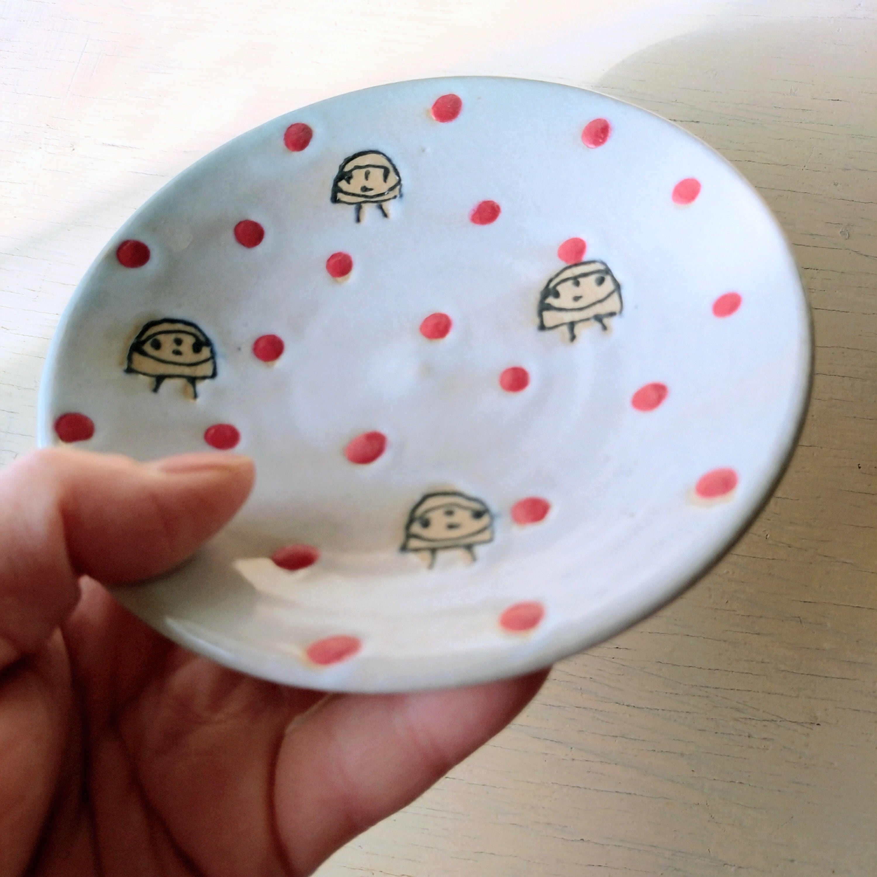タイラミホコ『赤の水玉たち』小皿」は、可愛らしい赤の水玉が特徴の小鉢です。